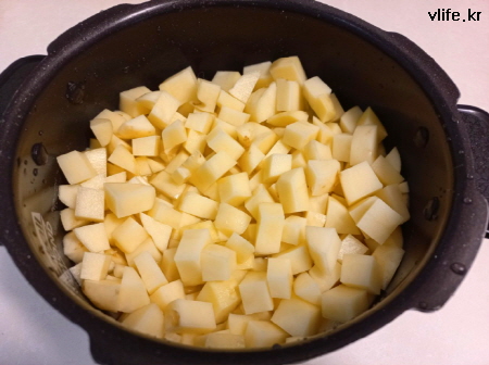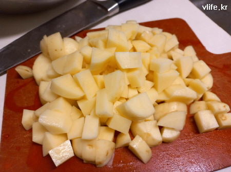 껍질 벗긴 감자를 크지 않게 썰었어요.