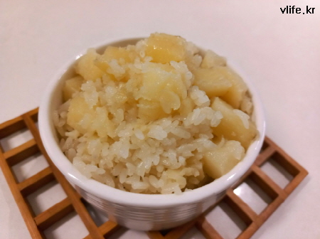 쌀 넣고 쌀에 맞게 밥 물 부은 뒤 감자 얹어 일반 취사 했어요.