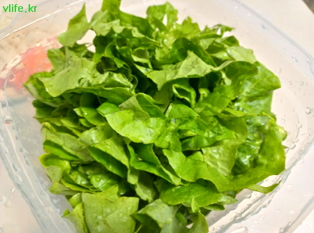 깨끗이 씻어 물기 턴 상추(쌈채소도 몇 장 섞였어요)를 대충 1cm 정도로 썰었어요.