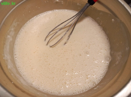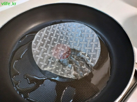 라이스페이퍼 올린 뒤 오그라들기 전에 바로 반죽을 올려요.