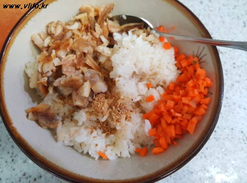 밥+조기+당근+참기름+깨소금 넣어 골고루 비비고