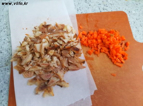 씹히는 식감을 위해 당근 썰었고 조기도 잘게 잘랐어요.
