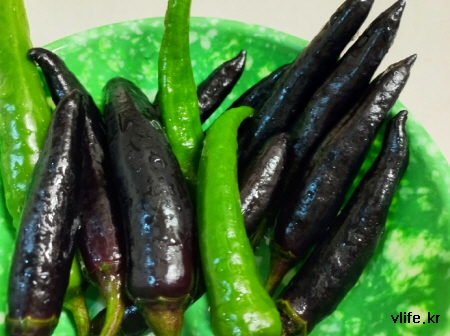 짙은 보라보라 한 색이 색다른 가지고추, 맵지 않은 풋고추 종류여서인지 1도 맵지 않아요.