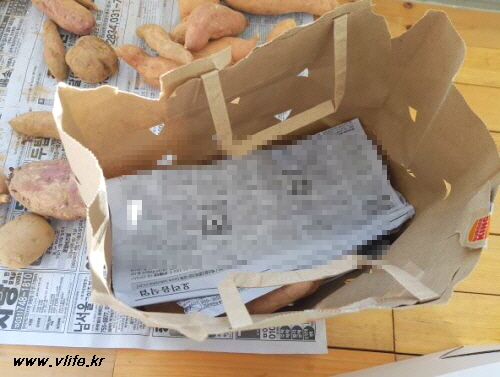 고구마나 감자 한 층 깔고 신문 덮고를 반복.