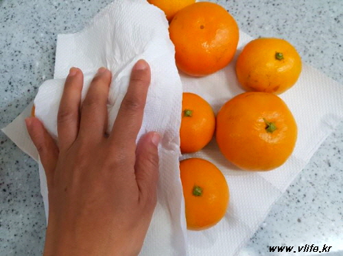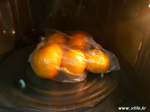 두 번째 귤 청, 씻은 후 물기 닦고 꼭지 제거 뒤 전자레인지에 3분 돌리기