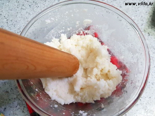 밀대나 절구 공이(반죽 달라붙으면 물 묻혀 가며)로 5분쯤 콩콩 찧었어요.