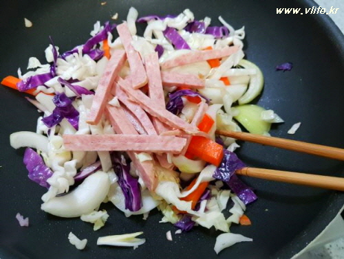 준비물; 양배추, 햄, 양파, 당근, 간장, 참기름, 깨소금, 후추, 식용유