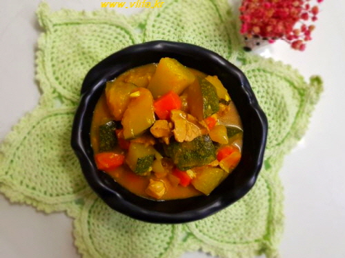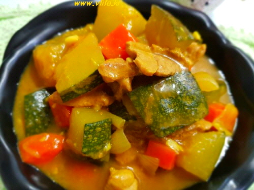 준비물; 호박, 돼지고기, 양파, 당근, 마늘, 카레, 소금, 식초, 식용유