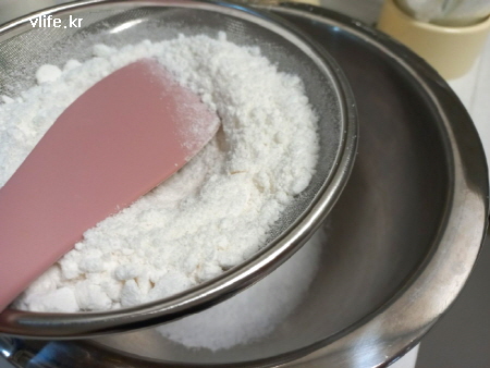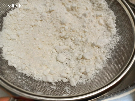고운 체에 갈린 쌀 붓고 주걱으로 살살 긁거나 체를 탁탁 쳐 가며 고운 가루만 거르고