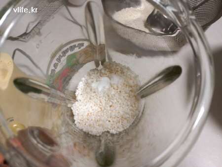 잠깐 돌리고 믹서기 멈춤, 숟가락으로 잘 안 갈린 쌀 위치 잡아 주고 다시 믹서기 윙~
