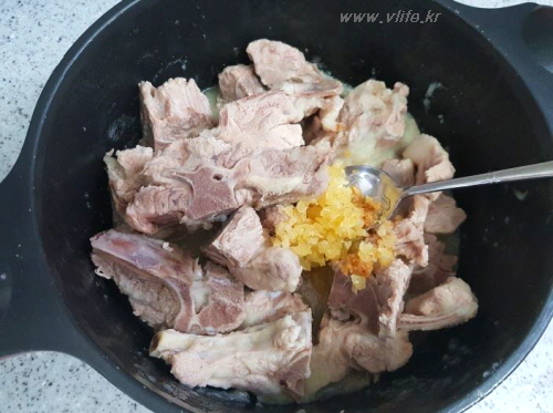 뒤적이며 뼈에서 살이 스르르 떨어질 때까지 푹 끓여요.