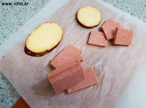 고구마 모양에 맞춰 햄도 썰었고요.