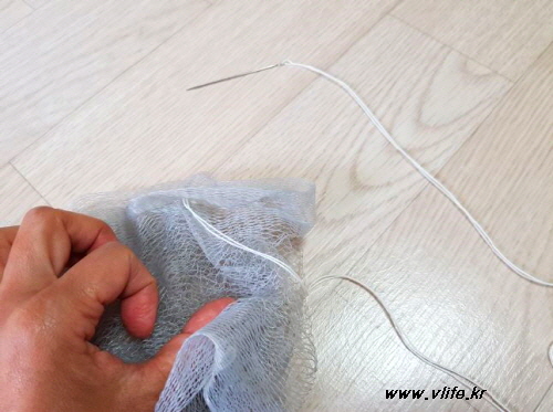 구멍이 슝슝 뚫려 매듭이 빠질 수 있으니 실 사이로 바늘 빼 단단하게 고정후