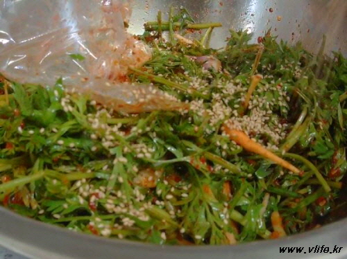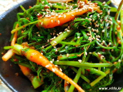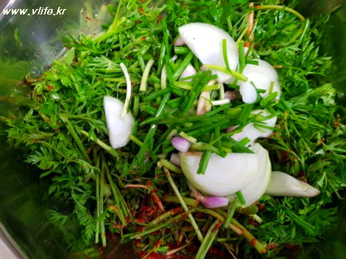 준비물; 당근 잎, 쪽파, 양파, 마늘, 생강, 액젓, 양파청(설탕), 고춧가루, 통깨