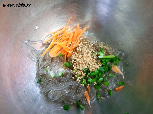 준비물; 달걀, 당면, 부추, 당근, 간장, 설탕, 참기름, 깨소금, 소금, 후춧가루