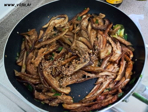 식용유에 파 넣어 볶아 파 기름 만들어 가지 넣고 잠깐 볶다가 간장, 마늘, 깨소금 넣어 볶다가 마지막에 참기름 약간 넣어 볶아