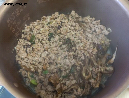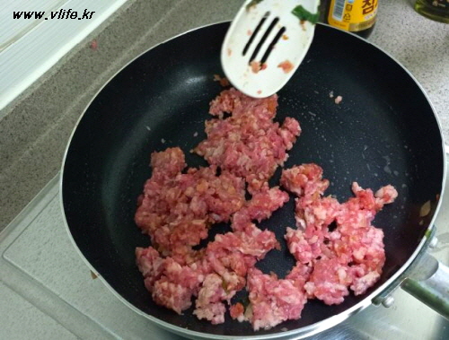 식용유 약간에 간 돼지고기 볶다가 마늘, 간장, 맛술이나 소주, 깨소금 넣어 볶아