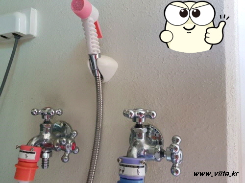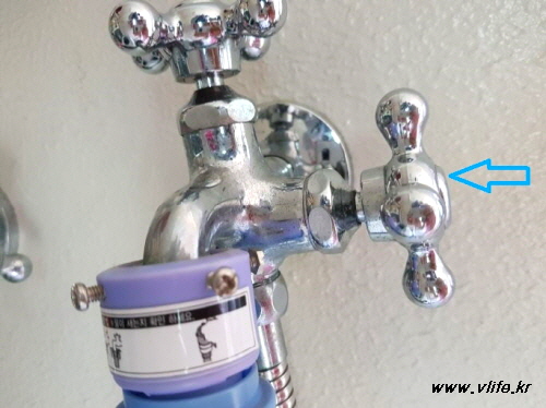 오른쪽 분사기 수도꼭지 잠겼나 확인해요.