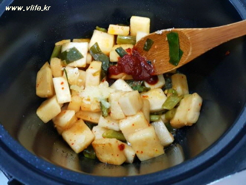 마늘, 설탕 조금, 고추장 넣고 섞어 또 뚜껑 덮어 두고 가끔 저어 주다가