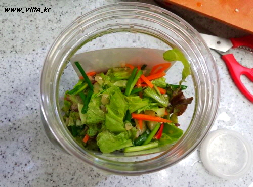 보관통에 절은 상추 넣고 만들어둔 국물 살살 부어요.