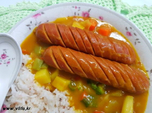 큼지막한 소시지를 통째로 넣고 카레를 만들었어요.