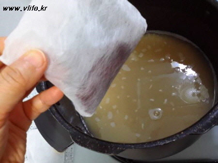 한쪽에는 비트 가루 팩 넣고 끓기 시작하면 색깔 상태 봐서 중간에 꺼내요.