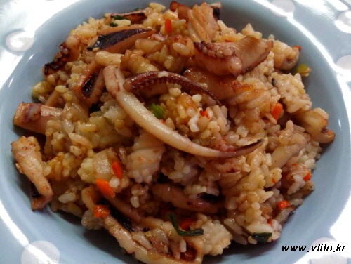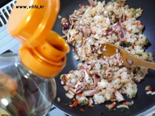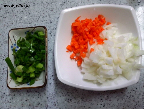 준비물; 오징어, 밥, 당근, 양파, 쪽파, 올리브유, 간장, 소금, 참기름, 깨소금, 후추