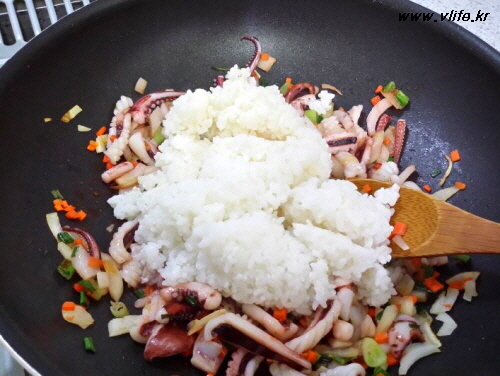 오징어 50%쯤 익도록 볶다가(기름 부족하면 보충해 가며)
