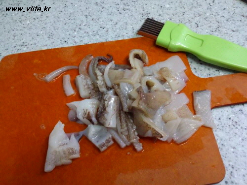 오징어 깨끗이 씻어 파채칼로 칼집 내고 큼직하게 썰기