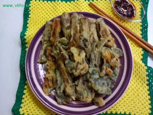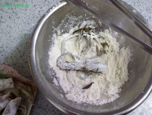 남은 부침가루에 물 부어 약간 걸쭉하게 반죽해 두릅 담갔다가
