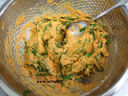 부침가루는 마(최소한의 물을 넣고 간)가 엉길 정도만 넣었고, 밀가루 넣을 때는 소금으로 간을 해요.