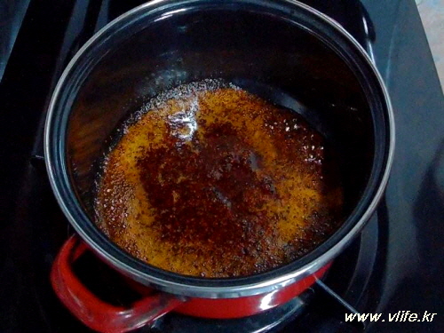 식용유 뜨겁게 달궈 청양 고춧가루 넣고 달달 볶아 기름만 걸러 식혀 고추기름 만들어요.