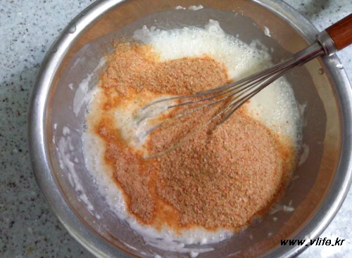 물 넣어 덩어리 없이 잘 풀고 건새우 가루 넣고 또 잘 풀고.