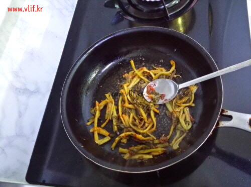 준비물; 무청 시래기, 짜파게티, 고춧가루, 설탕, 된장, 후춧가루, 기름 약간