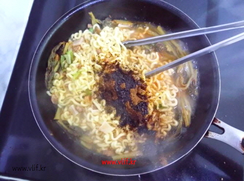 물 끓여 짜파게티 면과 건더기 스프 90%쯤 익히고