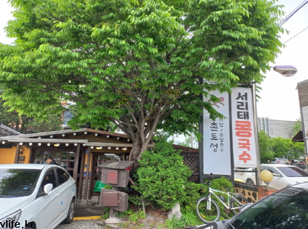 나무옆 건물이 식당인데 오른쪽이 반려견 동반 구역이고 왼쪽이 일반 손님용이에요.