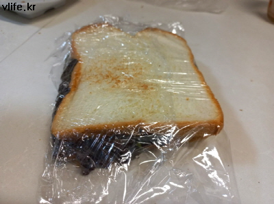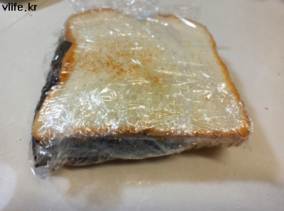 식빵을 한 손으로 누르고 랩을 당겨 가며 양쪽을 접어 붙이고
