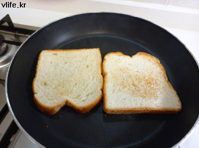 냉장고에 있던 식빵이라 팬에 앞 뒤로 구웠어요.