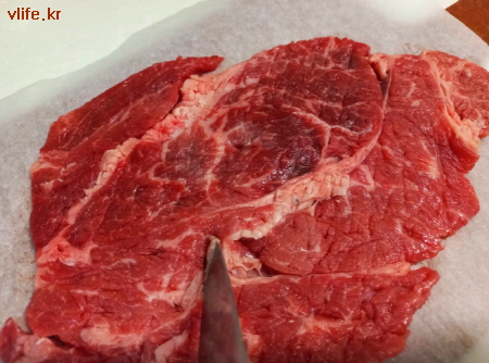 덩어리채로 하려니 힘줄 따라 고기가 분리 돼서 애 먹었어요. 적당한 크기로 잘라서 할 걸 그랬어요.