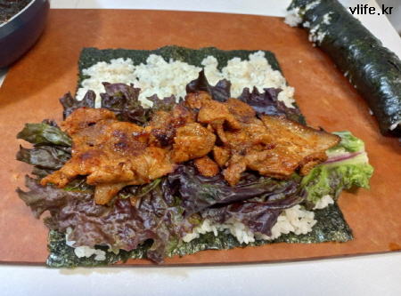 밥 고르게 펴고 상추, 고기 올려 도르르르르