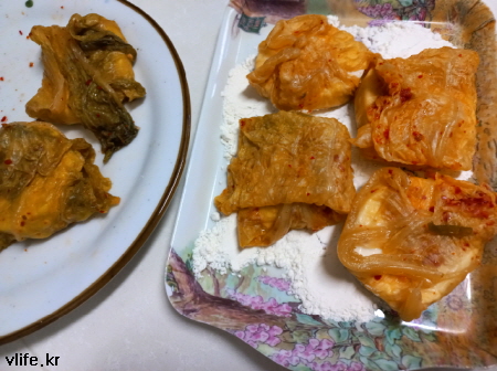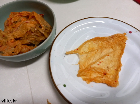 1센티 조금 안되게 잘라(부서지지 않게 조심) 김치로 잘 감싸서