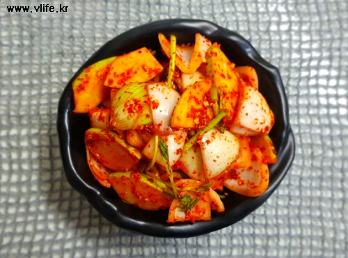 알싸한 양파의 매운맛을 살짝 빼고 새콤달콤한 사과를 섞어 김치를 담갔어요.